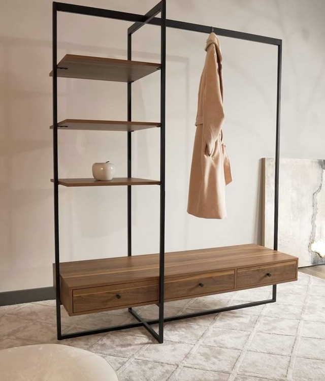این محصول علاوه بر ظاهری چشمنواز، کاملاً کاربردی طراحی شده است؛ بخش رگال برای آویزان کردن لباس، و قفسهها و کشوهای چوبی برای نظمدهی به وسایل یا اکسسوریهای تزئینی مناسباند.