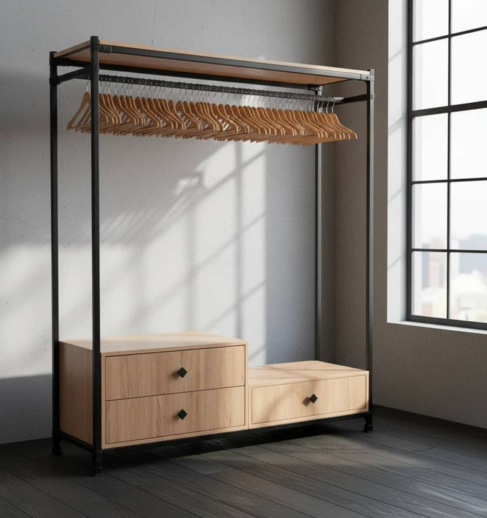 این رگال لباس با طراحی مدرن و کاربردی، انتخابی ایدهآل برای نظمدهی حرفهای به لباسها و تکمیل دکوراسیون فضاست. وجود دو کشوی جادار، امکان نگهداری منظم لباسهای تاشده و اکسسوریها را فراهم کرده و فضای آویز، دسترسی آسان به لباسهای روزمره را ایجاد میکند.