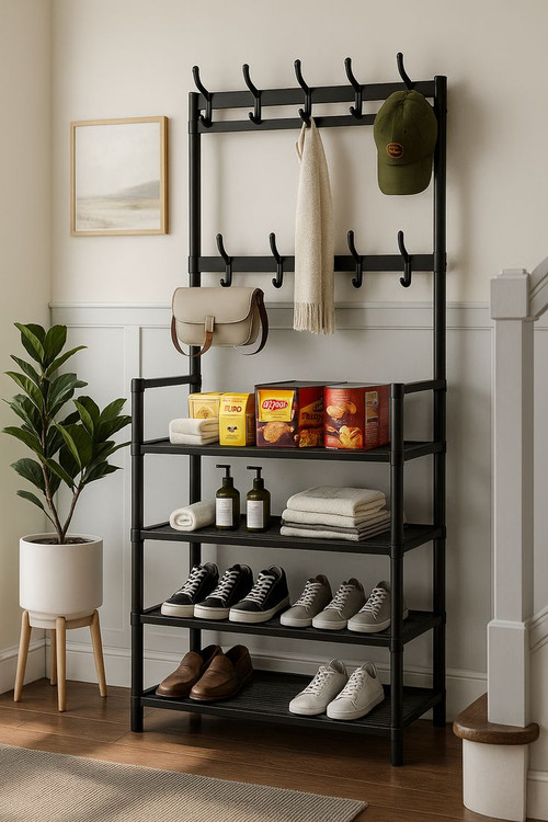 🍀🍀ورودی خانه خود را با این جالباسی و جاکفشی مینیمال مرتب و شیک نگه دارید. بخش جالباسی برای لباس و کیف و طبقات جاکفشی برای کفش، دسترسی آسان و فضای منظم را فراهم میکند.