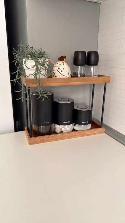 طراحی مینیمال با پایههای فلزی برای جلوهای مدرنتر و دسترسی راحتتر. ترکیب فلز با رنگ کورهای و صفحه چوبی باکیفیت، این شلف و استند را به انتخابی شیک و کاربردی برای آشپزخانه و لوازم و اکسسوری های آشپزخانه تبدیل کرده است.